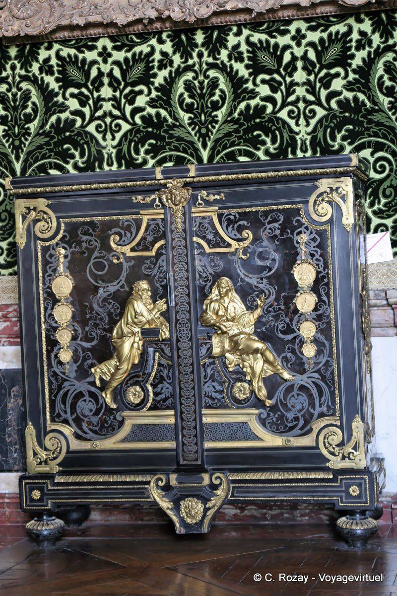 - Deux photos plus loin, il y a le détail de la porte de cette commode. Magistral, entre la sagesse de l'ancien et la frivolité de la dame. (Joe)