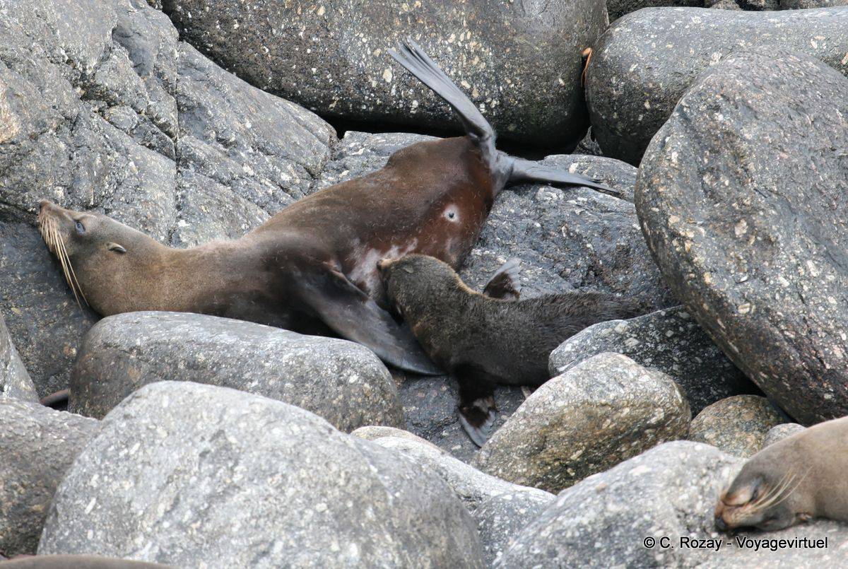 Pequeño león marino tratando de succionar su madre, focas del Cabo Foulwind, Tauranga, Westcoast - Nueva-Zelanda